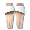 These Geta sandals have been designed by Kozue Hibino. With this design she wanted to make a Western style sandal with the spirit of Japanese geta clogs. The result is a shoe made of very light Japanese Hinoki cypress. The cool and clean design of the black leather strap creates a beautiful contrast with warm color and texture of the wood, and the crossed design ads a unique and fashionable feature.