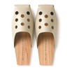 These Geta sandals have been designed by Kozue Hibino. With this design she wanted to make a Western style sandal with the spirit of Japanese geta clogs. The result is s shoe made of very light Japanese Hinoki cypress. The cute design of the punched white leather strap is a beautiful contrast to the warm color and texture of the wood. These Geta sandals are very popular for outdoor as well as indoor usage.